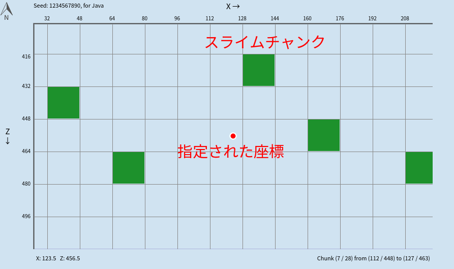 マップ上の緑の枠がスライムチャンクで赤い丸が指定された座標です。